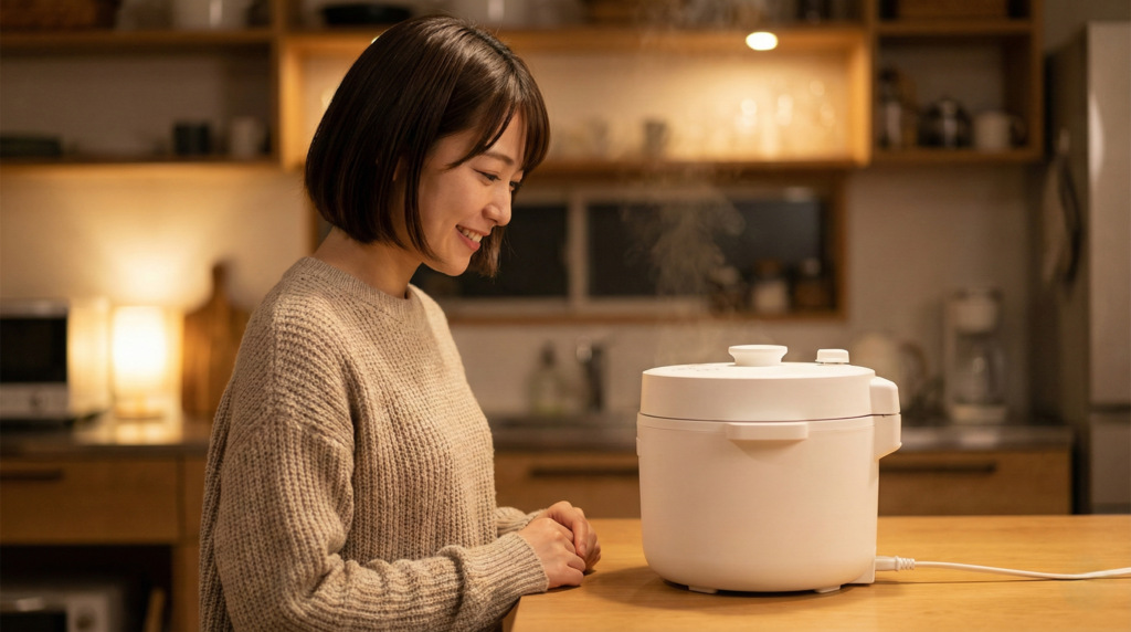 難しい液晶画面や、何十種類もあるメニューボタン。元気な時なら使いこなせるかもしれないけれど、疲れ果てた夜の私には、それは「情報の暴力」でしかありませんでした。 「これを押せば、煮えるよ」と、ただ静かに佇んでくれる真っ白なデザインが、私の部屋にも、疲れ切った心にも、一番しっくり来たんです。