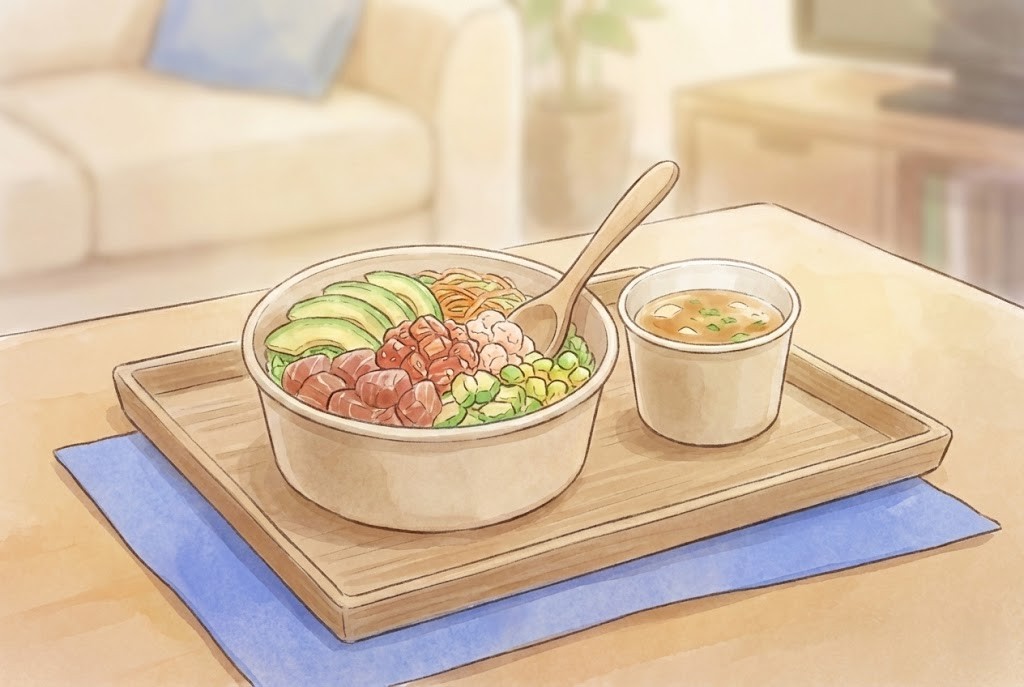 仕事が押して、時計の針が22時を指す直前。とにかく早く食べたいという夜は、配達パートナーさんが多くて待ち時間が読みやすいUber Eatsの出番です。到着予測の精度が高いので、25分以内のフィルターをかけて丼系の一択に絞ります。海鮮丼や鶏そぼろ丼は温度が落ちにくく、スプーン一本で完結するのが嬉しいポイントです。